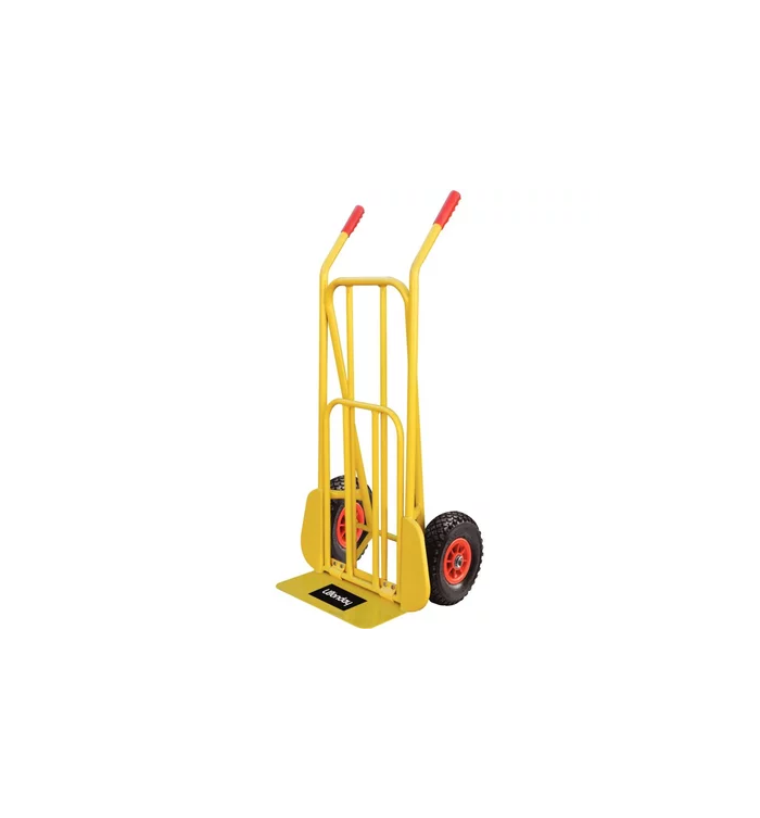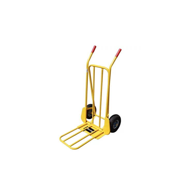 Diable pro en acier 250 kg. 2 roues gonflables. 1 bavette fixe 125x415mm, 1 bavette rabattable 350x530mm.