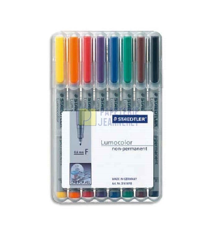 Le feutre "STAEDTLER LUMOCOLOR" est à l'origine destiné à la rétroprojection. Il permet néanmoins une écriture sur la plupart des surfaces lisses (verre, plastique, papier glacé). Son encre sèche très rapidement et n'est pas permanente. Ce feutre existe aussi en permanent (RET313, RET317, RET318...)