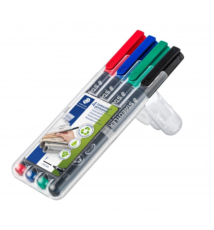 Feutre universel pour la rétroprojection et la plupart des surfaces : papier, carton, film de rétroprojection, plastique, métal, polystyrène, verre, porcelaine, bois, cuir, pierre, … ainsi que les CD et DVD