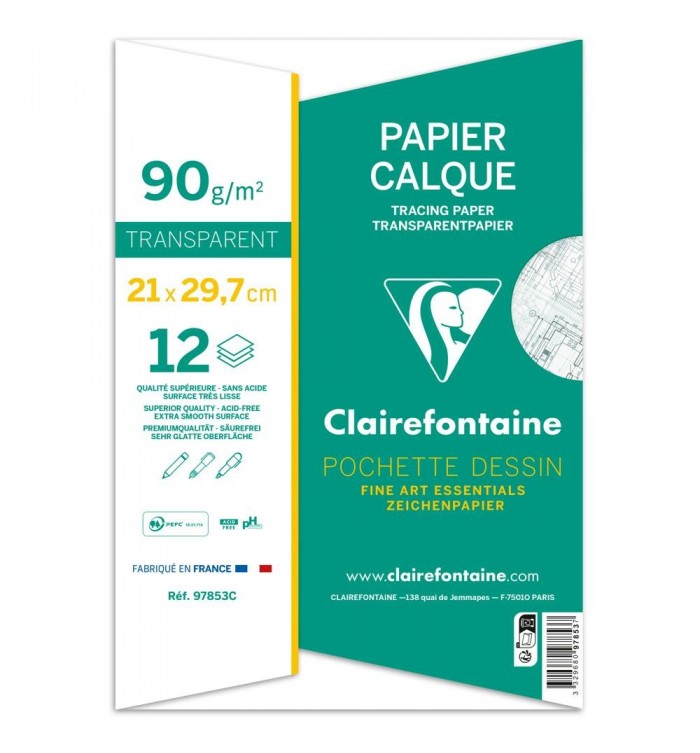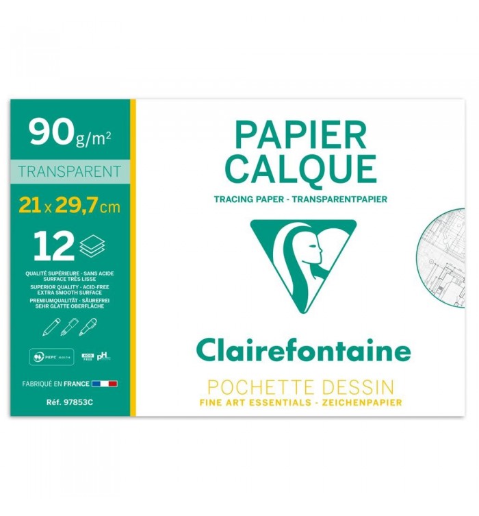 Pochette de 12 feuilles de papier calque A4 90/95g Clairefontaine 97853C, idéal pour les usages techniques et créatifs, est une solution hautement transparente offrant une belle alternative au plastique. Ce papier biodégradable et recyclable, sans acide et de pH neutre, allie durabilité et polyvalence.