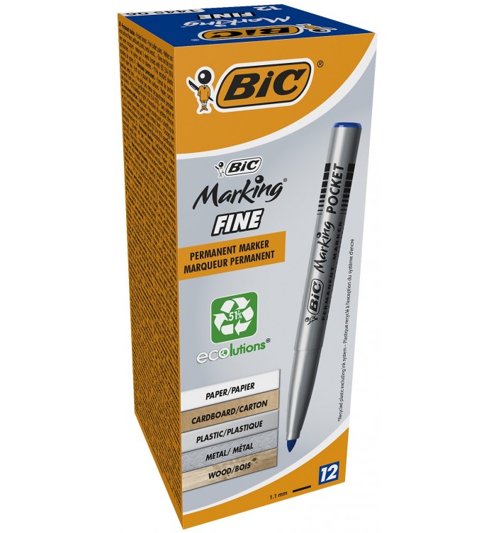 Le marqueur permanent BIC Marking Fine ECOlutions est un choix optimal pour un marquage maîtrisé, fin et lisse. Il convient parfaitement à des travaux minutieux de type marquage précis sur des objets et écriture fine sur des étiquettes de rangement. Son encre à base d'alcool possède de nombreux atouts. Elle est conçue pour résister au dessèchement puisque le feutre peut rester décapuchonné un mois sans s'assécher. Ses couleurs ne passent pas lors de l'exposition à la lumière. Son odeur est faible et rend l'expérience d'écriture agréable. Longue vie au marqueur indélébile BIC Marking Fine ECOlutions : il écrit 1 km. Depuis les années 1950, BIC fabrique des produits d’écriture d’excellence distribués partout dans le monde et au meilleur prix. Sa marque BIC Velleda est spécialisée dans les marqueurs effaçables et tableaux blancs pour les professionnels. Éco-conçu, ce feutre indélébile est fabriqué avec 51% de matière recyclée (à l’exclusion de son système d’encre), ce qui réduit l’impact sur l’environnement. Bien joué BIC.