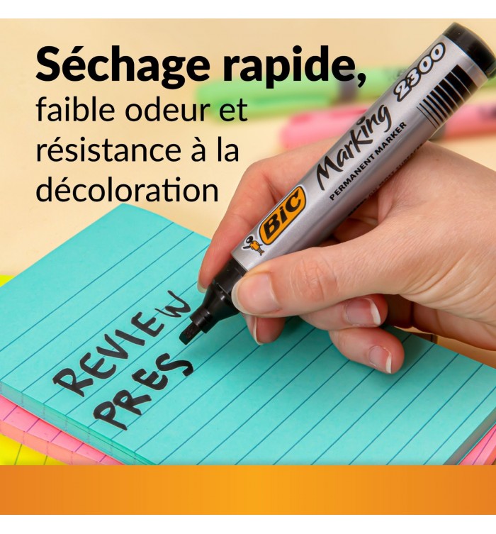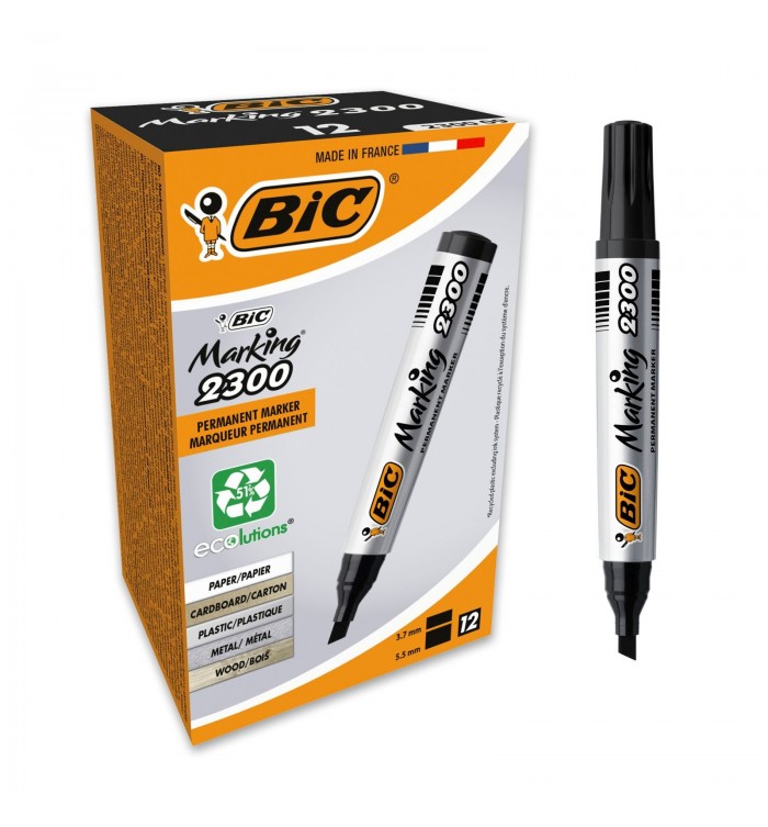 Le marqueur BIC Marking 2300 ECOlutions est un feutre indélébile éco-conçu fabriqué avec 51% de matériaux recyclés (à l'exception du système d'encre). Marqueurs noirs, idéal pour écrire sur la plupart des surfaces type cartons, plastiques, métaux, CD. Leur pointe biseau très résistante permet de faire varier l'épaisseur des tracés entre 3,7 et 5,5mm.