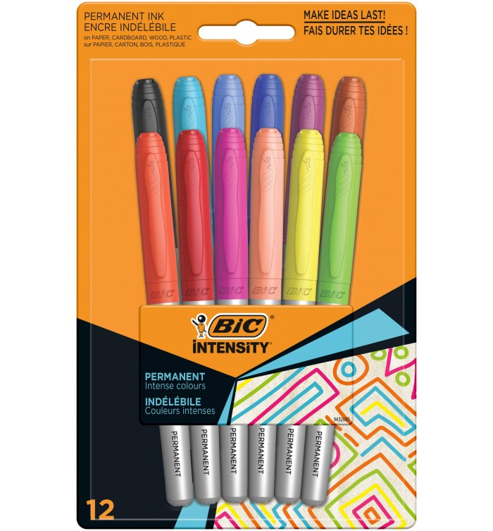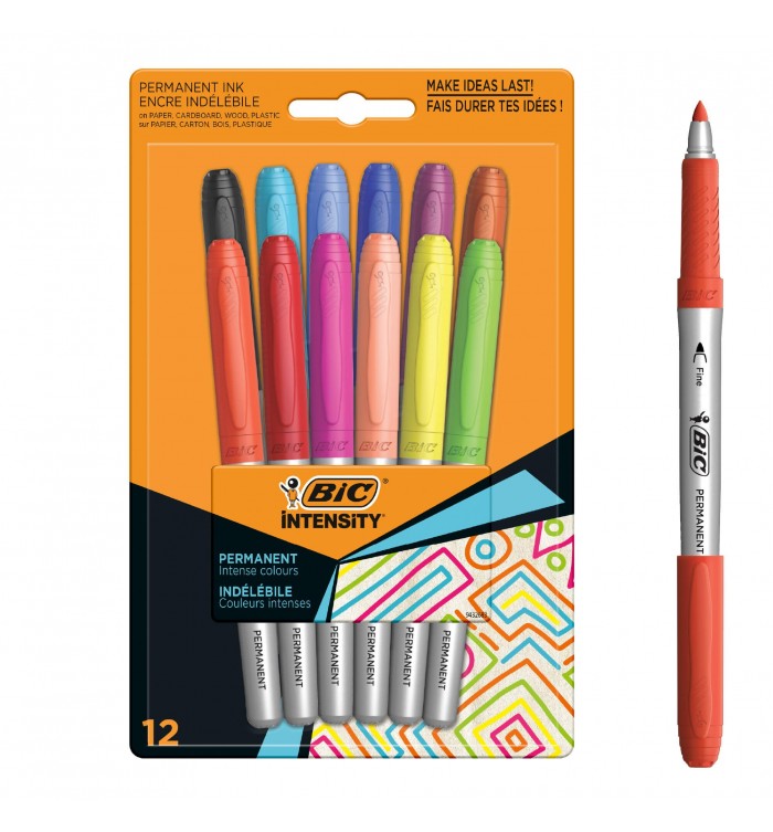 Pour BIC Intensity, la créativité est à la portée de tous et pas seulement des « artistes ». BIC Intensity propose une large gamme d’outils créatifs aux couleurs intenses qui vous encouragent à libérer votre créativité simplement et quotidiennement, à votre façon. Créez sans avoir la pression de devoir produire un résultat « parfait » ! Les feutres indélébiles BIC Intensity produisent un trait moyen de 0,8 mm offrant une couleur intense. Déclinés en 12 nuances intenses, ils vous aident à personnaliser vos objets préférés. Leur encre opaque marque la plupart des surfaces : idéal pour les loisirs créatifs ou pour organiser vos projets. Ils permettent d’écrire sur le papier, le carton, le plastique, le verre, le métal – et même le papier enduit ou les photos. L’encre de ces feutres BIC Intensity sèche rapidement pour un travail propre et précis. Leur odeur est faible pour ne causer aucun désagrément. Leur grip confortable en caoutchouc permet un tracé précis sans fatigue. Grâce à leur débit d’encre régulier, l’écriture est fluide et douce, sans bavures ni risques de pâtés. Ces produits BIC haute qualité sont accessibles et faciles à utiliser par tous. Ils inspirent une créativité spontanée où que vous soyez. Cette gamme comprend des stylos à pointe fine, crayons de couleur, feutres de couleur, marqueurs indélébiles, feutres pinceau et bien plus, le tout dans une large gamme de couleurs. Depuis plus de 65 ans, les instruments d’écriture et de dessin de BIC s’adaptent au style original de chacun.