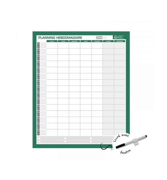 Planning perpétuel hebdomadaire réutilisable - 60 x 50 cm - HEURE PAR HEURE SUR 7 JOURS