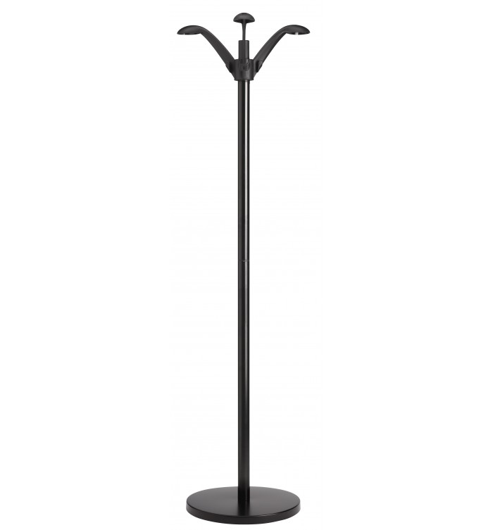 Tête tournante. 3 patères robustes assurant un parfait maintien du vêtement. Le trou sur le dessus permet d'y accrocher un cintre. Acier peinture époxy noire. Hauteur 157 cm. Diamètre du socle : 34 cm.
