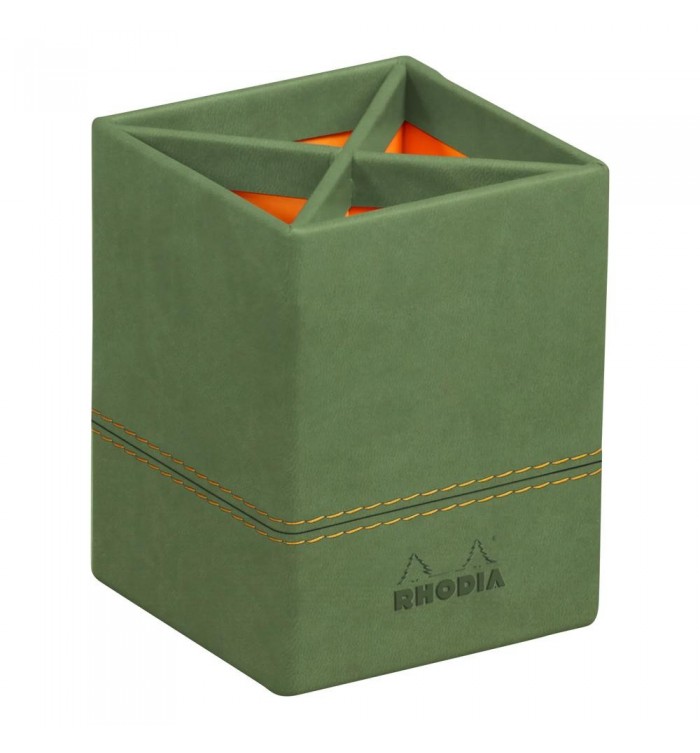 Le pot à crayons Rhodiarama est fabriqué en simili cuir italien de haute qualité, offrant une apparence luxueuse sans compromis sur la durabilité. Les finitions soignées, telles que le logo Rhodia embossé et les élégantes surpiqûres sellier orange, ajoutent une touche de sophistication à votre bureau. Sa couleur sauge rafraîchissante est parfaite pour apporter une note de modernité et de sérénité à tout espace de travail.