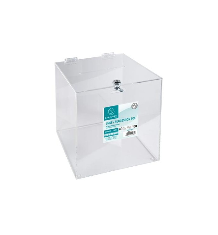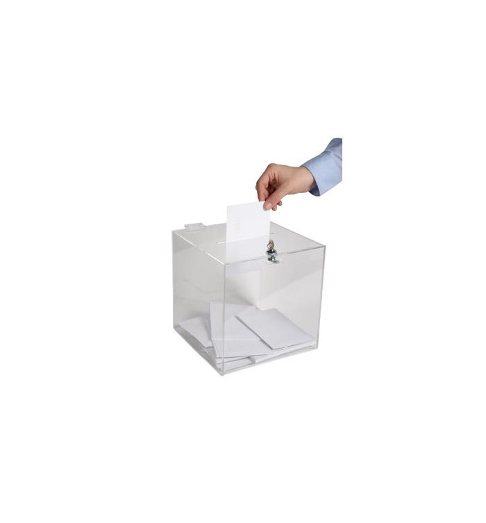 Une urne transparente avec fermeture à clef de dimensions 25x25x25cm, idéale pour sécuriser vos documents importants, clés, billets de tombola ou tout autre objet de valeur au sein de votre entreprise.