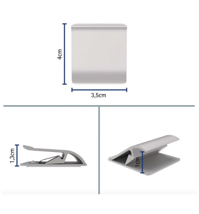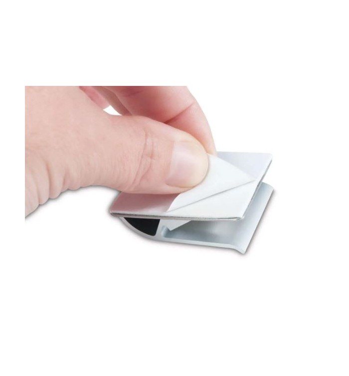 En montage individuel ou en bout à bout. Hauteur : 1.3 cm. Largeur : 4 cm. Ouverture de pince de 1 cm. Autoadhésifs, montés sur coussin de mousse masquant les inégalités de surface.