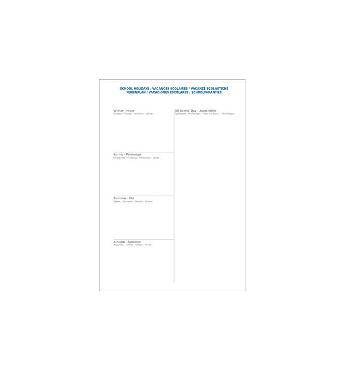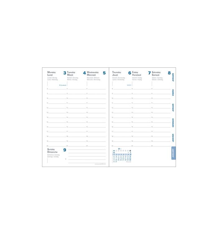 - Agenda hebdomadaire avec présentation de la semaine sur 2 pages afin d'offrir une vue d'un seul coup d'œil