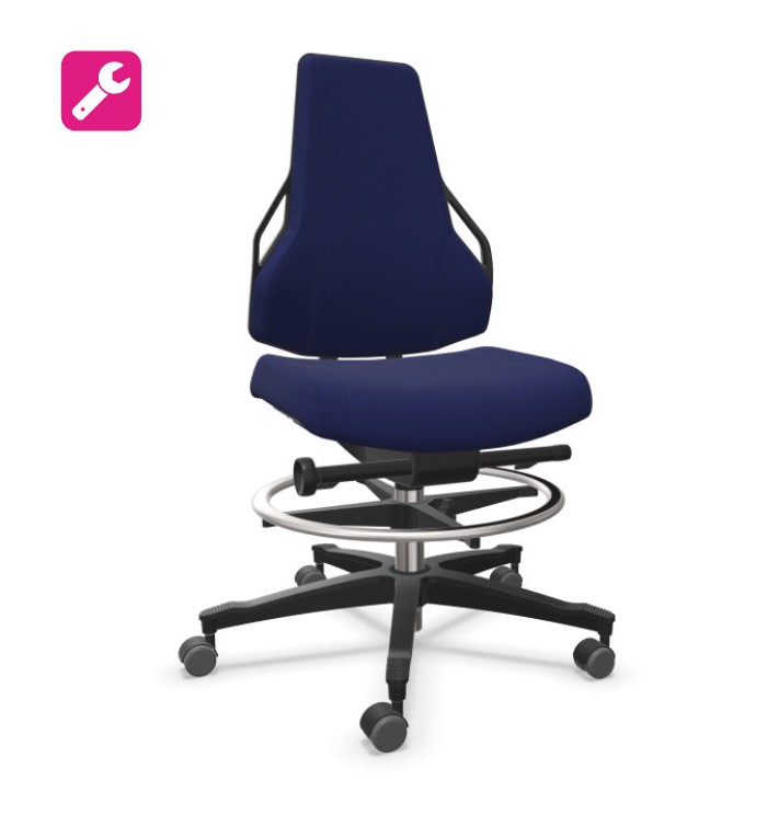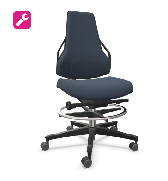- Hauteur d'assise réglable par levier, disponible en deux versions : de 460 à 620 mm pour les espaces standard, ou de 620 à 870 mm pour les postes de travail hauts avec repose-pieds intégré.