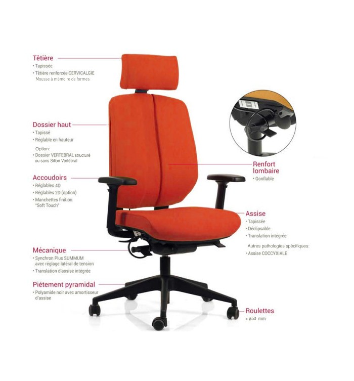 Il est équipé d’une têtière spéciale cervicalgie, d’accotoirs réglables 4D, d’une mécanique Synchrone Plus Summum avec manette de réglage de tension extractible, d’un renfort lombaire gonflable système “Air Lomb” et d’une assise translation intégrée.