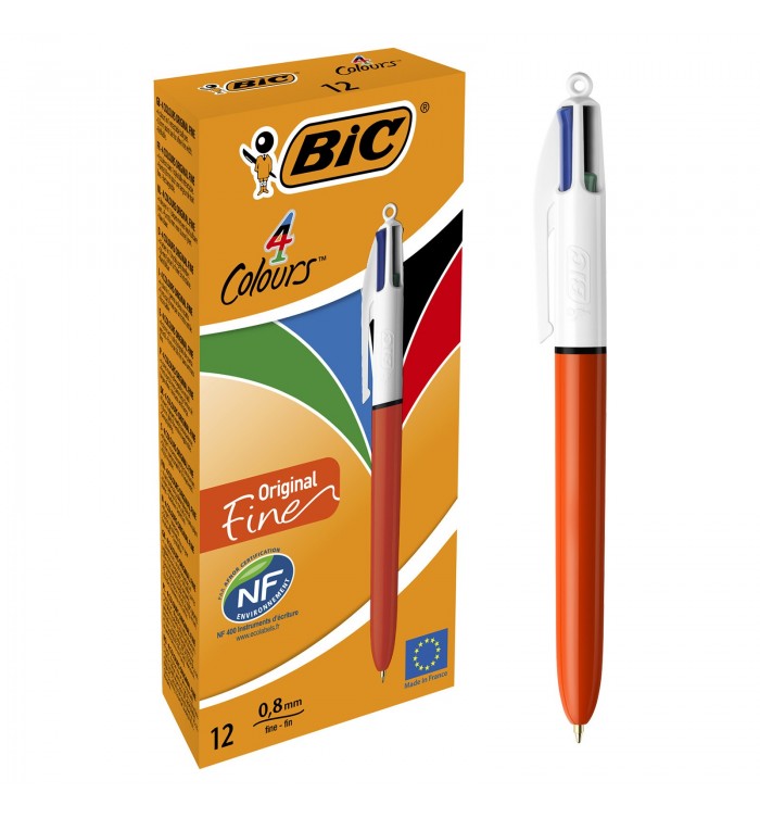 Classique revisité : c'est en 1970 que l'entrepreneur français Marcel Bich lance le stylo 4 Couleurs Original, qui permet de changer de couleur en un clic sans jamais changer de stylo. Incontournable à sa sortie, décliné en d'autres versions depuis, les stylos 4 Couleurs sont utilisés par les consommateurs BIC à travers le monde entier. Des millions de stylos 4 Couleurs vendus, mais qui ont toujours une place particulière dans l'histoire de chacun : stylo préféré de certains, instrument de travail journalier pour d'autres, trophée des amoureux de fonctionnalité, incontournable preneur de note pour les écoliers et lycéens, et instrument de création pour certains artistes. Intemporel, le design du BIC 4 Couleurs se repère : corps bicolore, clip pour l'accrocher aux cahiers et bille blanche percée en embout qui signe le produit.