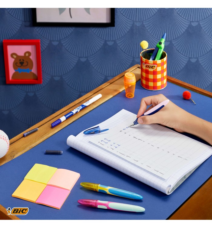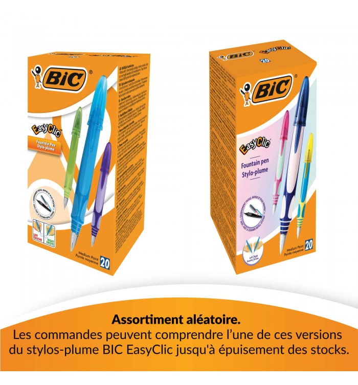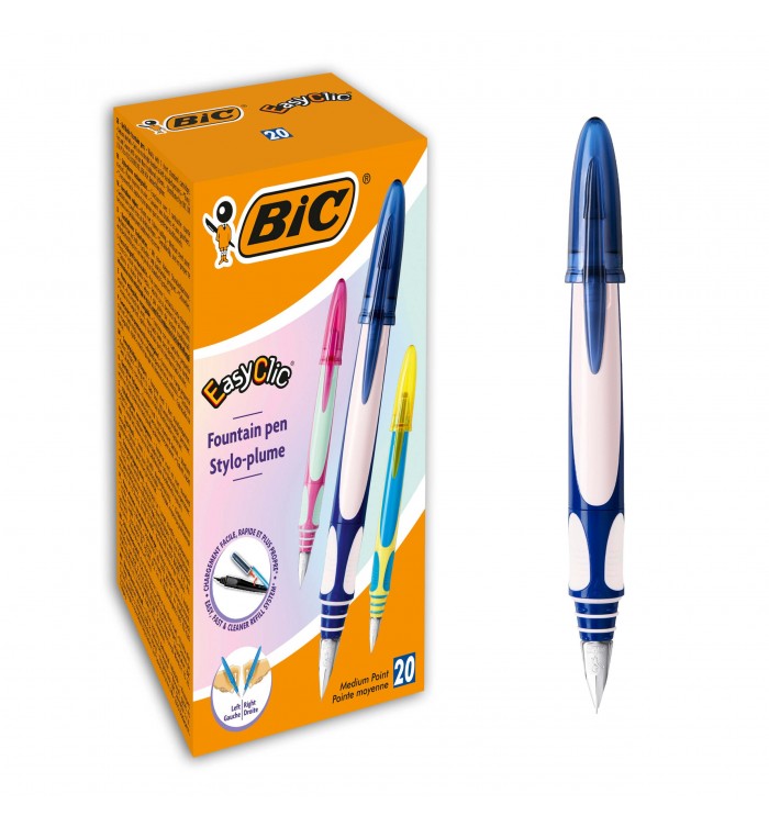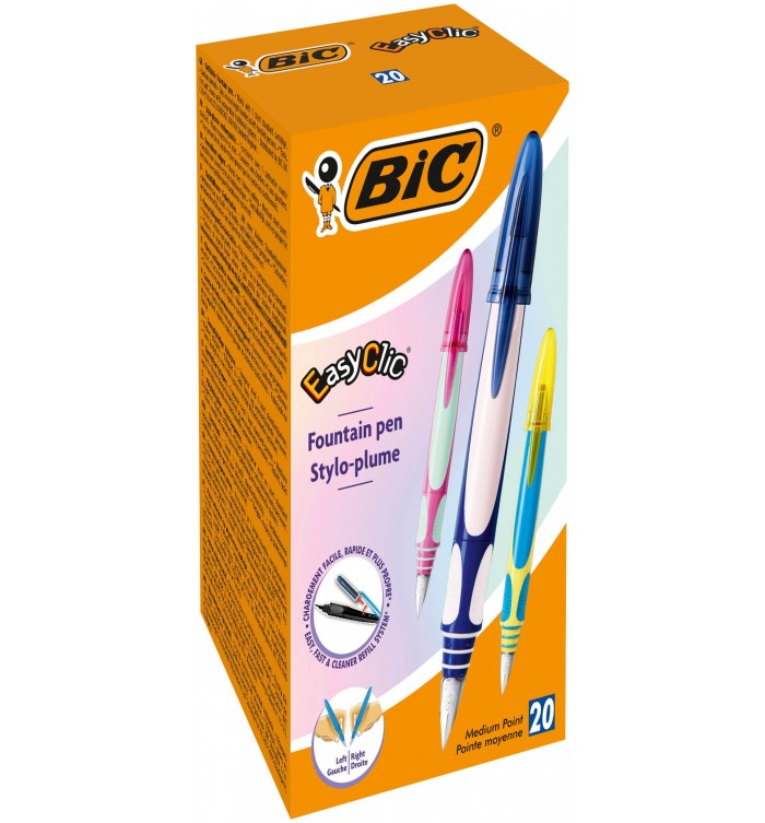 BIC Easy Clic est un stylo plume simple et facile qui élimine le désordre et les tracas de changer une cartouche d'encre, ce qui le rend idéal pour une utilisation en classe. Le système de recharge latéral innovant vous permet de vous débarrasser facilement de l'ancienne cartouche et de l'insérer rapidement, facilement et proprement. Le stylo prend une cartouche d'encre bleue standard courte et la pointe moyenne est en acier iridium et écrit avec une largeur de trait de seulement 0,5 mm, ce qui le rend plus propre et plus facile à utiliser que beaucoup d'autres stylos plumes. La poignée triangulaire peut être utilisée par les gauchers et les droitiers confortablement et est disponible en quatre couleurs de corps : rouge, bleu, rose et vert. Ce stylo plume est facile à utiliser et est idéal pour l'école, bien qu'il soit bon pour une écriture soignée où que vous soyez.Matériel nib: Iridium steel. Couleur: Multi. Description du produit: BIC Easy Clic.