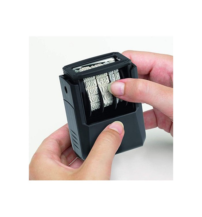 1 bande avec les années en 4 chiffres - Pour choisir la date que vous souhaitez imprimer, il vous suffit de retourner le boîtier, d’appuyer sur sa base pour faire apparaître la date et de composer la suite de caractères en les faisant tourner grâce aux quatre molettes crantées.