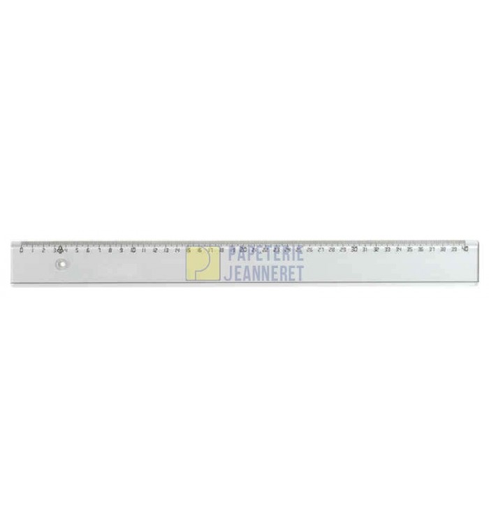 Règle plate en plastique. 1 biseau gradué en mm. Bord anti-taches. Longueur: 40 cm.