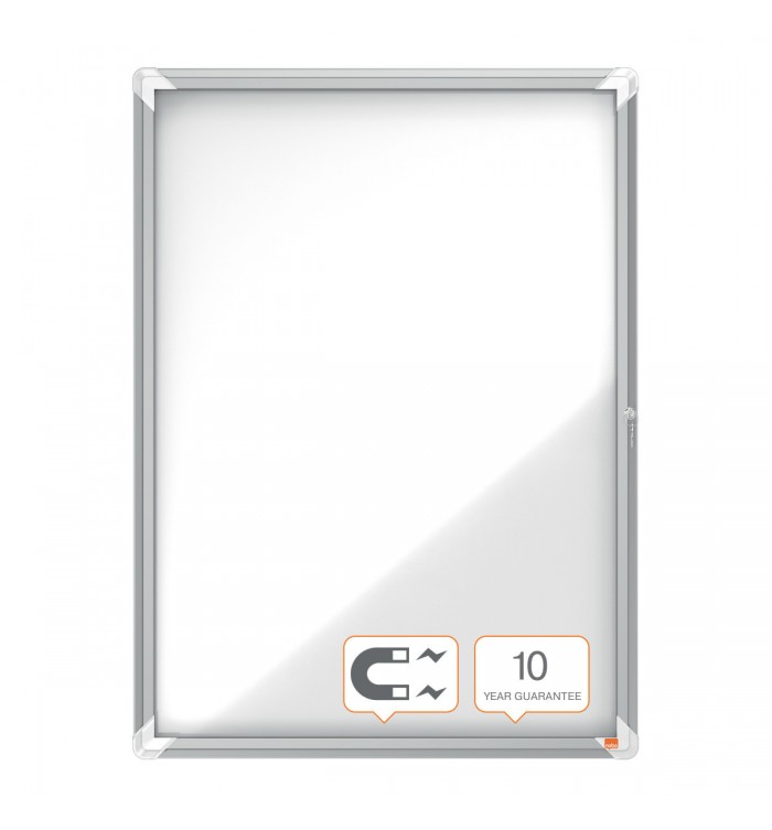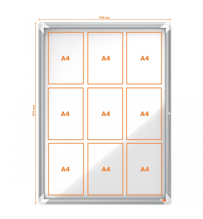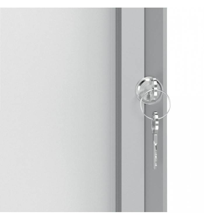 Vitrine d'affichage magnétique avec porte battante en verre sécurité et serrure sur le côté. Avec cadre moderne et élégant en aluminium et fixation murale par les coins. Excellente surface magnétique pour afficher vos communications en toute sécurité. Format : 9 feuilles A4.